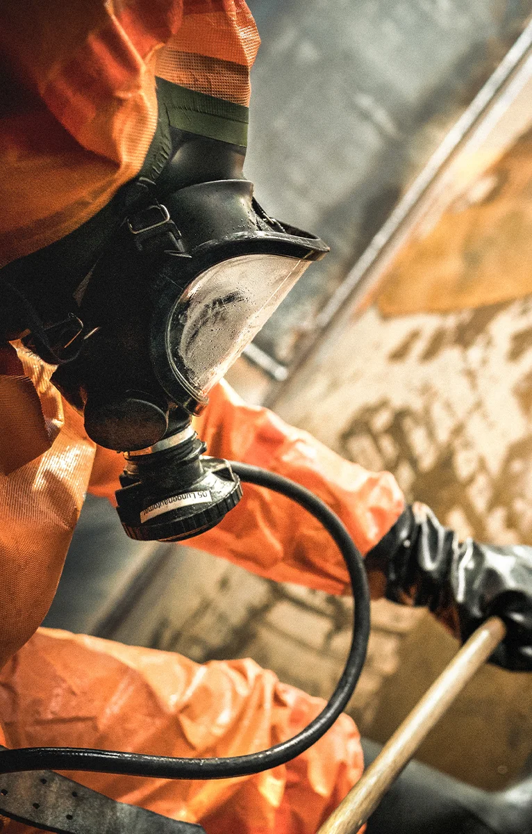 Mechanische Reststoffbeseitigung: manuelle Nacharbeit in beengten Räumen (Confined Space) mittels Ex-geschützter Werkzeuge und Industriesauger.